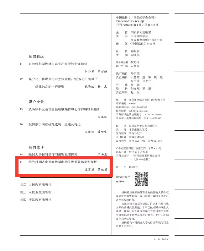 凌富亚博士、蒲佳丽老师在《中国编辑》(CSSCI来源期刊/北大核心期刊)(2022年第1期)上发表学术论文《抗战时期进步期刊传播中华民族共同体意识探析》。文章指出:抗战时期,中国共产党、亲共民主人士和团体,以及爱国人士创办了大量进步期刊。在民族危亡的时代背景下,各类进步期刊通过阐释中华民族概念、弘扬爱国主义精神、反对民族分裂主义、激活共同历史记忆、宣传抗日民族统一战线等方式,有效推动了中华民族共同体意识的广泛传播,促进了全民族抗战事业的发展,为当前各类期刊铸牢中华民族共同体意识提供了诸多启示。