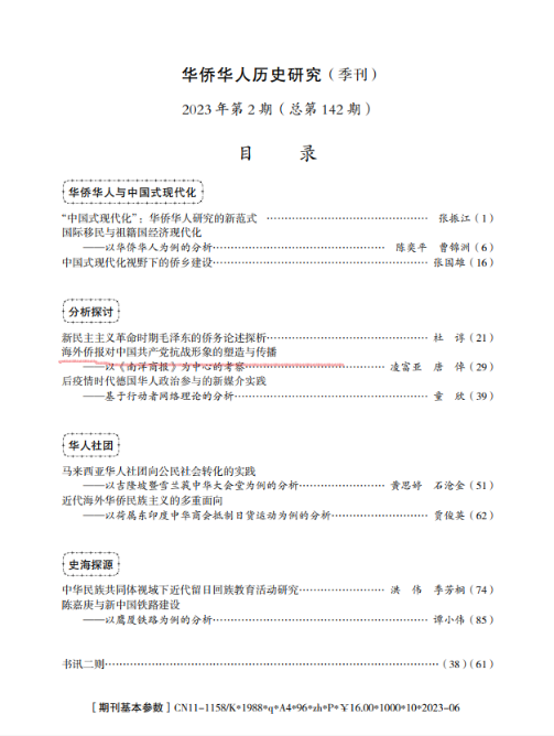 凌富亚副教授为第一作者、唐倬博士为通讯作者在《华侨华人历史研究》(CSSCI来源期刊)(2023年第2期)上发表学术论文《海外侨报对中国共产党抗战形象的塑造与传播——以<南洋商报>为中心的考察》。该文为凌富亚老师中国侨联课题最终成果(免于鉴定)。文章指出:抗战时期,《南洋商报》通过宣传中共抗日方针政策、歌颂人民军队抗战事迹、介绍抗日根据地建设成就、展现中共领导人光辉形象、报道中共与华侨携手抗战消息等多种方式,成功塑造了中国共产党的抗战形象。与此同时,《南洋商报》坚持以真实权威的新闻源取信读者,以主旨集中的议题设置引导读者,以多样适当的新闻体裁吸引读者,以立场鲜明的语言表达感染读者,实现了中国共产党抗战形象在南洋华侨社会的广泛传播。