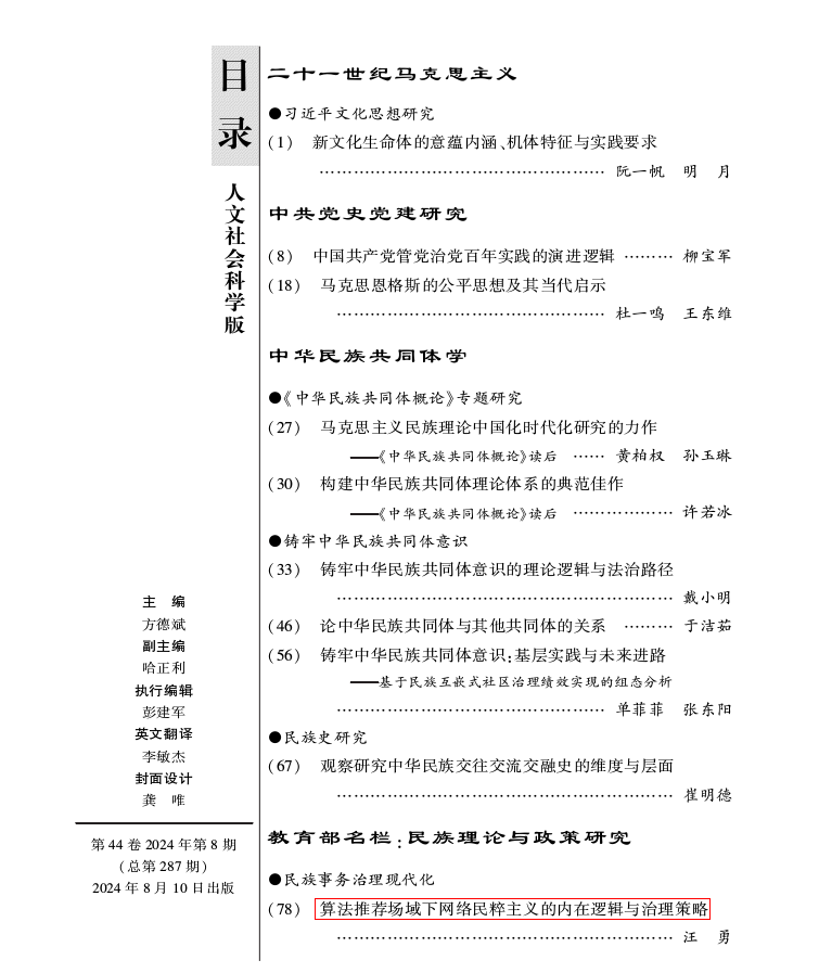 汪勇博士在《中南民族大学学报(人文社会科学版)》(CSSCI来源期刊/北大核心)(2024年第8期)发表学术论文《算法推荐场域下网络民粹主义的内在逻辑与治理策略》。文章认为:算法推荐以精准化特性普遍应用于网络空间,成为网络民粹主义生发的运行底色。网络民粹主义借算法推荐的技术赋权,利用网民的从众心理引导底层民众进行民粹主义的网络聚集、发酵和外溢,加剧了民粹主义的生发频率和影响范围,给我国网络生态和社会稳定带来了严重安全隐患。为此,基于技术、心理、实践等维度的逻辑分析,以价值引领、技术改进、素养提高、法治规制、社会公正来实施对网络民粹主义的全面治理,实现技术逻辑与价值逻辑的融合统一,并通过驾驭算法推荐破除网络民粹主义的生成,维护好风清气正的网络生态和团结稳定的社会环境。