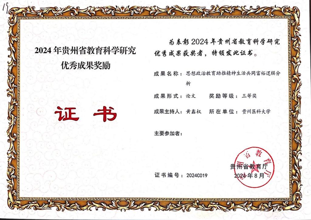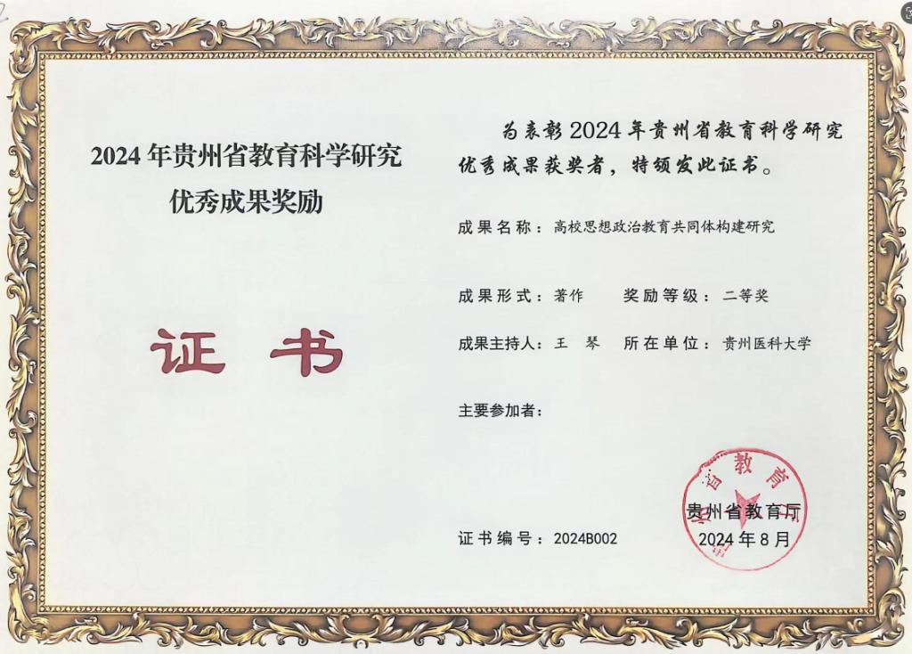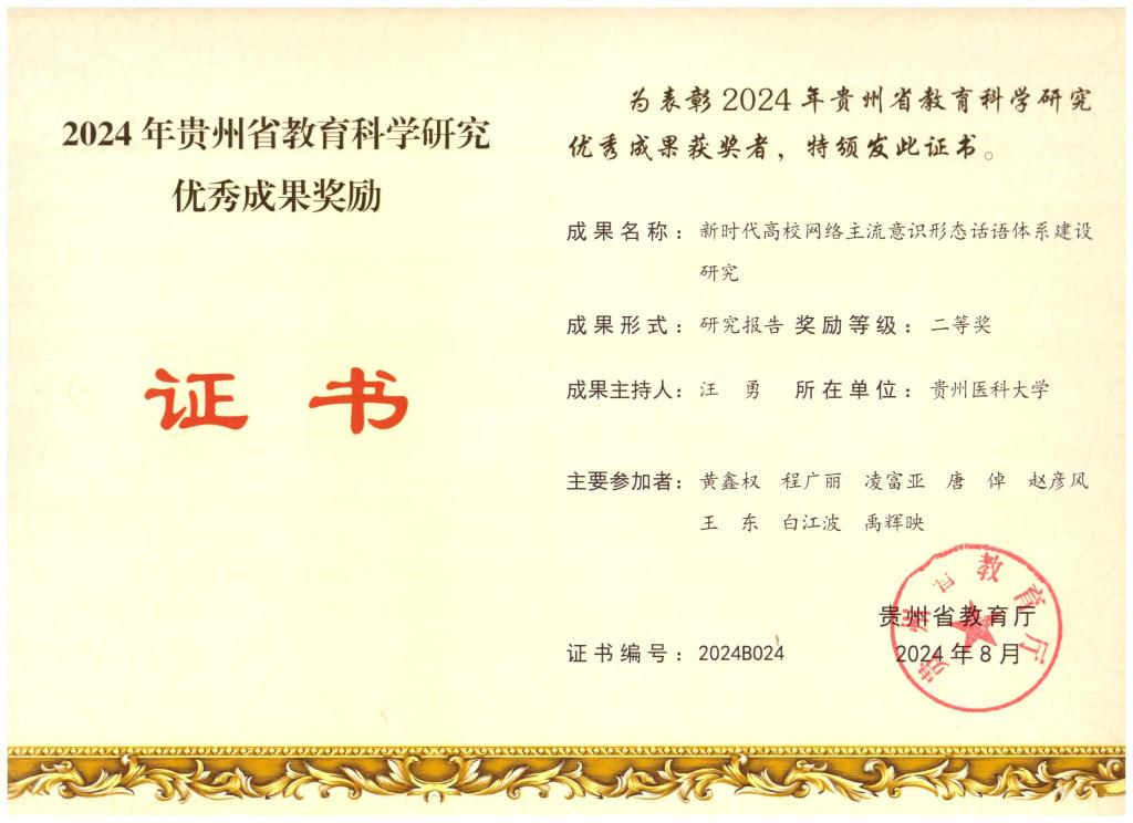 近日,省教育厅公布了2024年贵州省教育科学研究优秀成果奖获奖名单,我院获批3项,分别是王琴博士申报的《高校思想政治教育共同体构建研究》获著作类二等奖、汪勇博士领衔申报的《新时代高校网络主流意识形态话语体系建设研究》获研究报告类二等奖、黄鑫权教授申报的《思想政治教育助推精神生活共同富裕逻辑分析》获论文类三等奖。