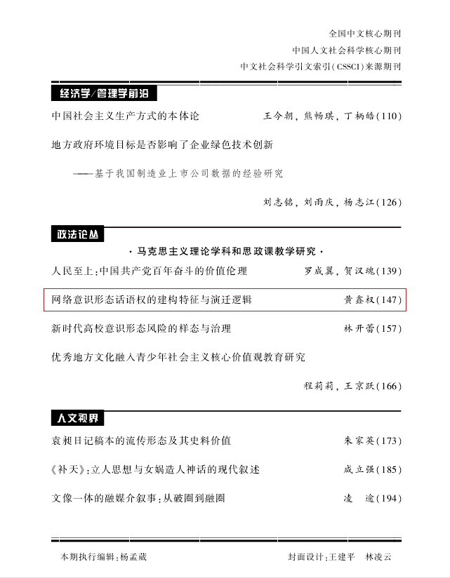 党委书记黄鑫权博士在《华南师范大学学报(社会科学版)》(CSSCI来源期刊/北大核心)(2024年第5期)发表学术论文《网络意识形态话语权的建构特征与演迁逻辑》。文章认为:在信息技术日趋发达和移动自媒体迅速发展的新时代,网络空间成为话语权利和话语权力争夺的主战场和主阵地。“现实、实体、线下”维度的传统意识形态话语权建构模式逐渐演迁为“线上线下、实体互动、现实虚拟”维度的现代网络意识形态话语权治理模式。从话语主体模式的转型、话语客体状态的转变、话语空间建构的转换三重维度深刻把握网络意识形态话语权建构的演迁逻辑,对有效防范和化解网络意识形态领域的主要风险点、不断提升新时代网络意识形态话语权具有重要意义。