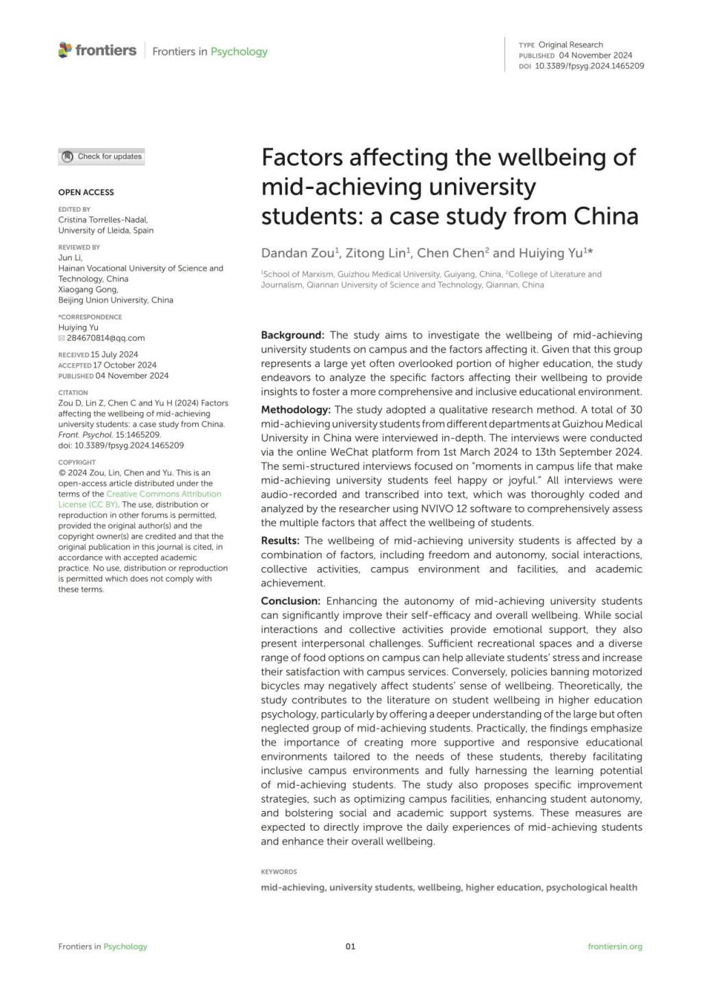 邹丹丹博士以第一作者身份在SSCI收录期刊《Frontiers in Psychology》(JCR 2区)发表学术论文《Factors affecting the wellbeing of mid-achieving university students: a case study from China》,国产自拍