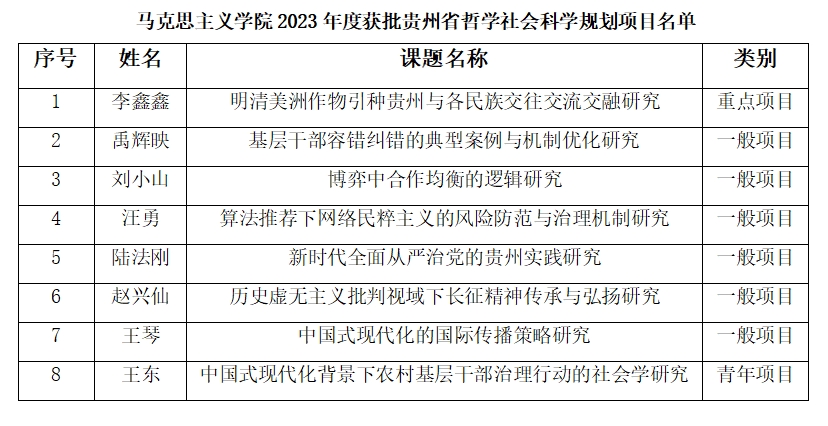 共有8位教师获批。其中,李鑫鑫申报的“明清美洲作物引种贵州与各民族交往交流交融研究”获批重点项目,禹辉映申报的“基层干部容错纠错的典型案例与机制优化研究”、刘小山申报的“博弈中合作均衡的逻辑研究”、汪勇申报的“算法推荐下网络民粹主义的风险防范与治理机制研究”、陆法刚申报的“新时代全面从严治党的贵州实践研究”、赵兴仙申报的“历史虚无主义批判视域下长征精神传承与弘扬研究”、王琴申报的“中国式现代化的国际传播策略研究”获批一般项目,王东申报的“中国式现代化背景下农村基层干部治理行动的社会学研究”获批青年项目。