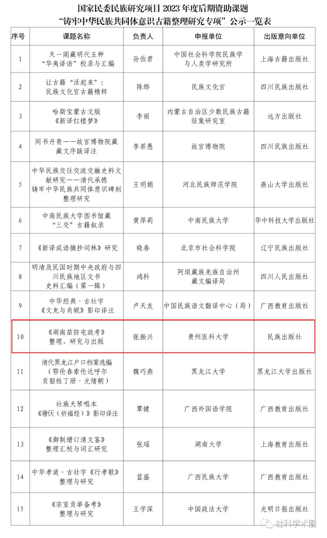 2023年12月4日,国家民委科研项目管理办公室(国家民委理论研究司)公示了2023年度国家民委民族研究项目后期资助课题立项名单,国产自拍 张振兴博士申报的“《湖南苗防屯政考》整理、研究与出版”成功入选。