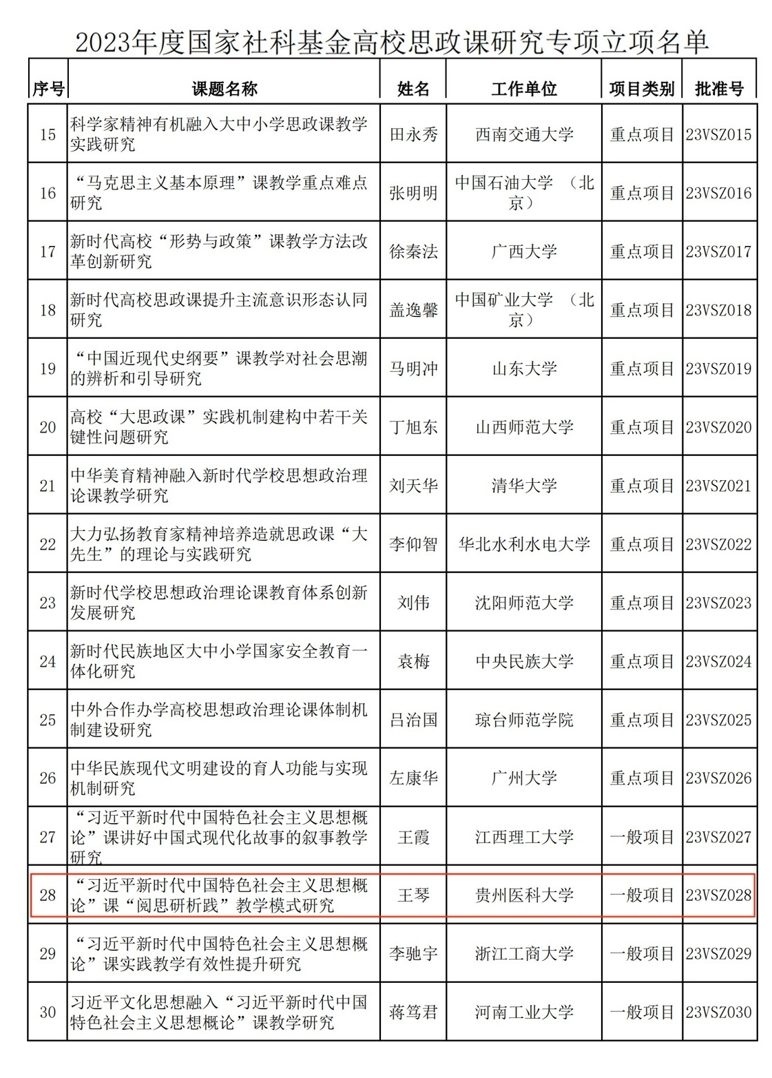 12月22日,全国哲学社会科学工作办公室公布了2023年度国家社科基金高校思政课研究专项立项名单,全国共批准立项171项,其中贵州省获批3项。我校国产自拍 王琴副教授申报的《“习近平新时代中国特色社会主义思想概论”课“阅思研析践”教学模式研究》(项目编号:23VSZ028)获批立项,这是自2019年设立国家社科基金高校思政课研究专项以来,我校首次获得该专项课题。