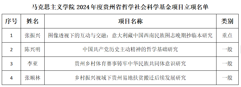 获批重点项目1项、一般项目3项。分别是:张振兴的“图像透视下的互动与交融:意大利藏中国西南民族图志晚期抄临本研究”、陈兴明的“中国共产党历史主动精神的哲学基础研究”、李亚的“贵州乡村体育赛事铸牢中华民族共同体意识研究”、张顺林的“乡村振兴视域下贵州易地扶贫搬迁后续发展研究”。立项数再次取得了好成绩。