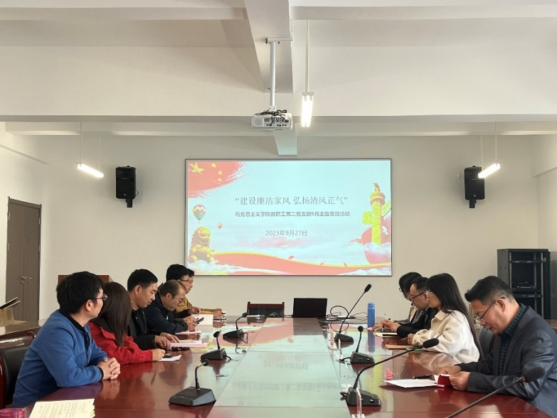 为进一步践行习近平总书记关于家庭家教家风建设的重要论述精神,涵养良好的党风政风,9月25日,学院教职工第二党支部在云漫湖校区善思楼433会议室以“建设廉洁家风弘扬清风正气”为主题开展宣传教育活动。活动由支部组织委员王东主持。