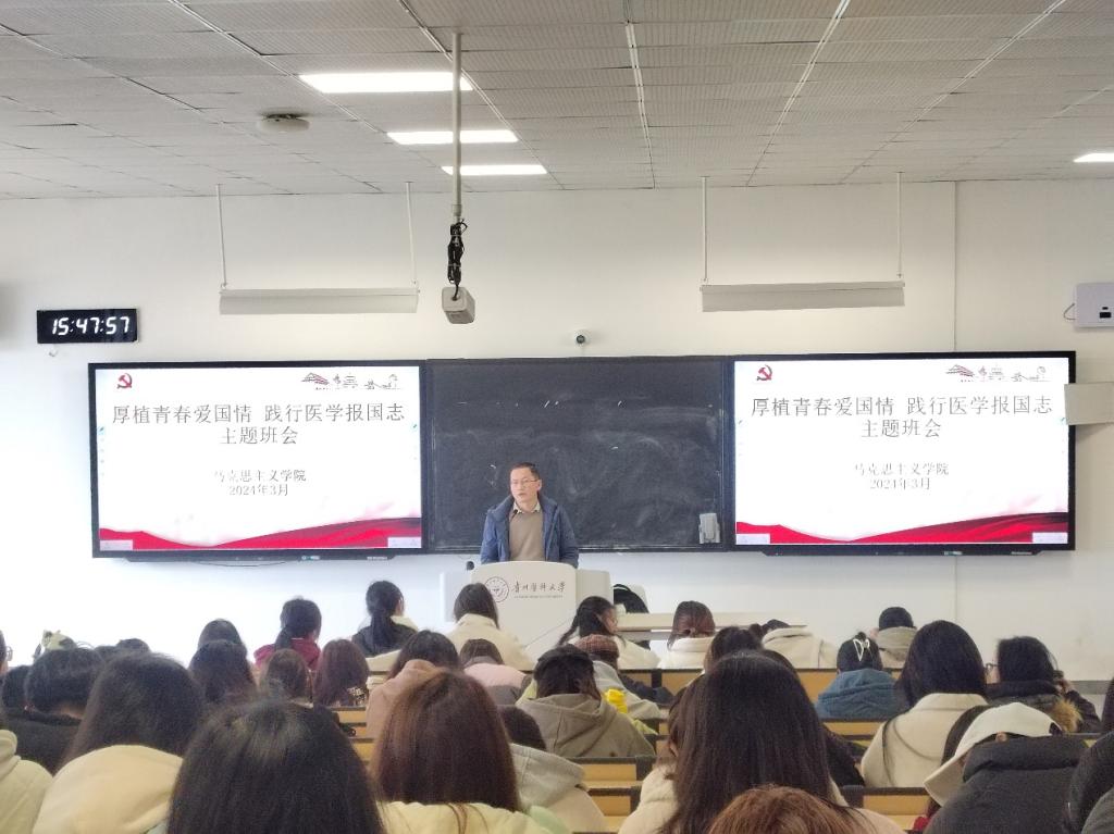 组织全院学生在善思楼R107教室以“厚植青春爱国情 践行医学报国志”为题开展主题班会。班会由辅导员马景瑶主持。