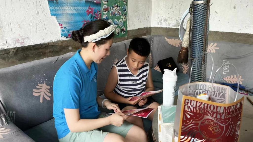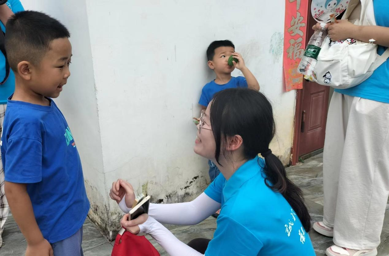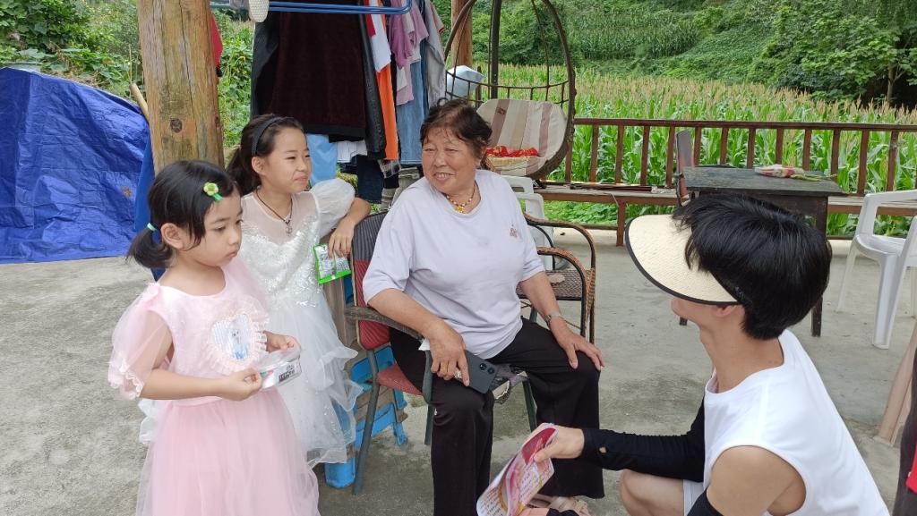 随后,实践队被分为三个小组,深入村民家中访谈,了解当地群众的生活变化情况和对红色文化的认知情况。队员们通过有奖问答环节与孩子们进行交流互动,寓教于乐的同时积极宣传新中国成立75周年以来的伟大成就。如我国神舟十八号载人飞船的成功发射、医疗健康保障的进步等,让村民和孩子们接受红色精神的熏陶,并从中深切感受到在中国共产党的领导下人民生活走上了幸福安康之路、国家走上了繁荣富强之路。同时,宣传活动也将理论知识与社会实践紧密结合,提升了实践队员的社会责任感和实践能力。