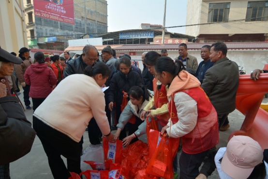梁业洁正在给老人发放慰问品