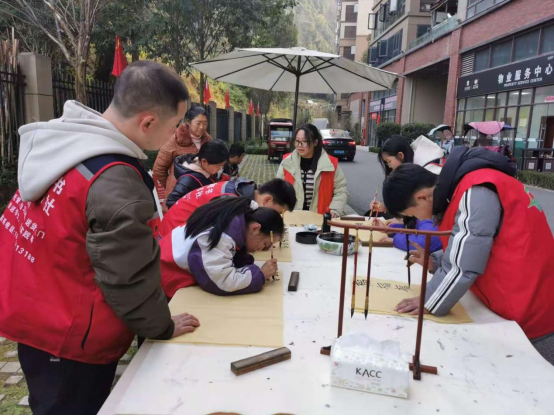 邹欣君与伙伴一起写福字送新春祝福