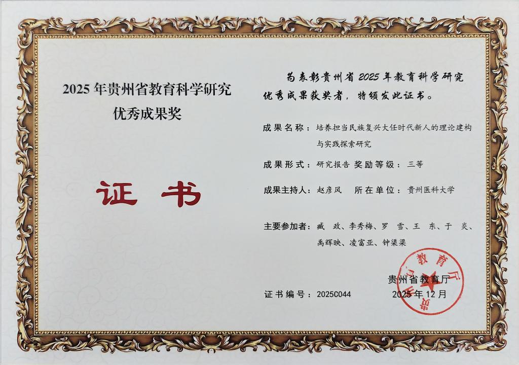 近日,贵州省教育厅公布了2025年教育科学研究优秀成果奖评选结果,国产自拍 喜获3项奖项,展现了在教育科学研究领域的扎实实力。此次获奖成果涵盖终身教育、时代新人培养、大学生历史自信教育等方向。其中,王琴申报的《逻辑・价值・实践:终身教育赋能教育强国研究》(论文)荣获二等奖;赵彦风申报的《培养担当民族复兴大任时代新人的理论建构与实践探索研究》(研究报告)、肖蓉申报的《新时代大学生历史自信教育研究》(研究报告)均获三等奖。