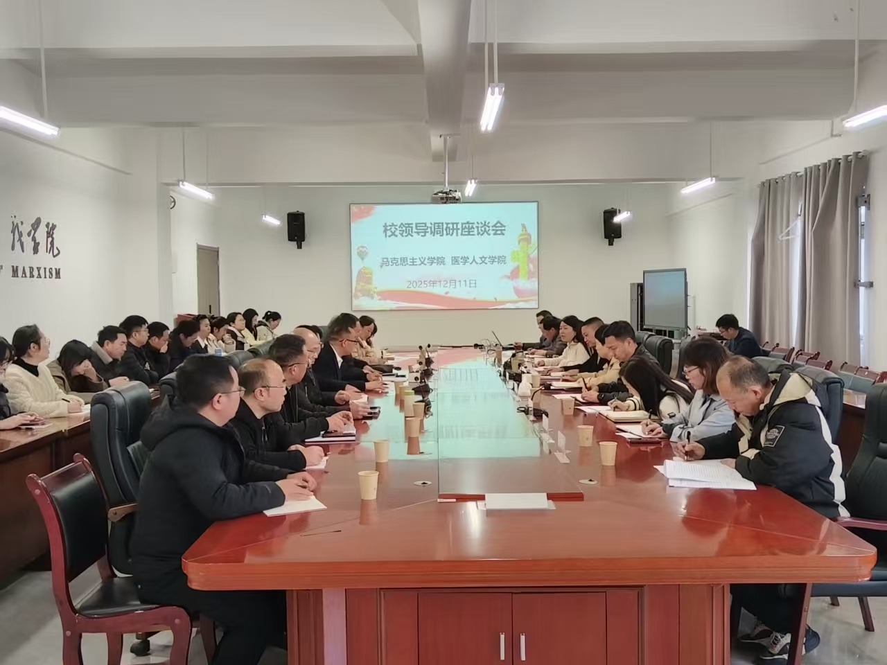 、医学人文学院领导班子成员、副科级以上干部、教研室主任及部分教师代表参加调研座谈会,会议由校党委副书记张洁主持。