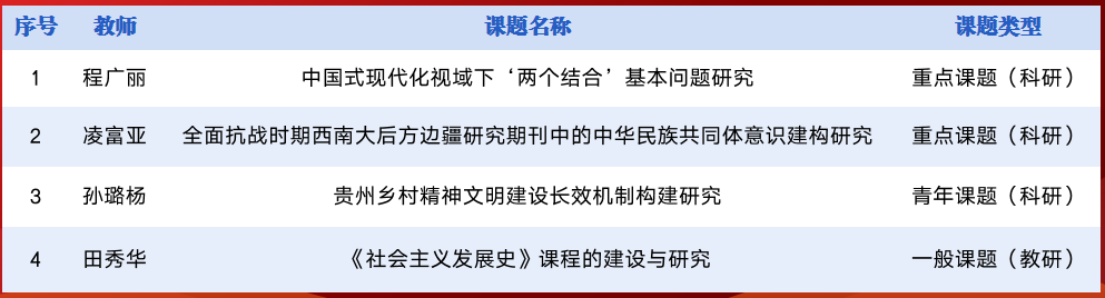 成功获批3项贵州省哲学社会科学规划课题、1项省级教学内容和课程体系改革项目,科研、教研工作再获新绩。此次立项项目包括:程广丽教授申报的重点课题“中国式现代化视域下‘两个结合’基本问题研究”(基础研究,马克思主义理论学科);凌富亚教授申报的重点课题“全面抗战时期西南大后方边疆研究期刊中的中华民族共同体意识建构研究”(基础研究,中国历史学科);孙璐杨博士申报的青年课题“贵州乡村精神文明建设长效机制构建研究”(应用研究,马克思主义理论学科);田秀华博士申报的一般课题“《社会主义发展史》课程的建设与研究”。