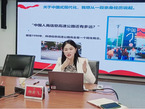党史党建研究中心研究员杨若飞老师主讲。杨老师以”以中国式现代化推进中华民族伟大复兴”为题,剖析了何为“牢牢把握以中国式现代化推进中华民族伟大复兴的使命任务”,阐明“中国式现代化的中国特色和本质要求”,告诉大家“中国式现代化”的提出是经历了几代共产党人的探索的结果,引导大家思考“什么是中国式现代化的新道路?”“为什么走中国式现代化新道路?”及“如何走好中国式现代化新道路?”三个问题。