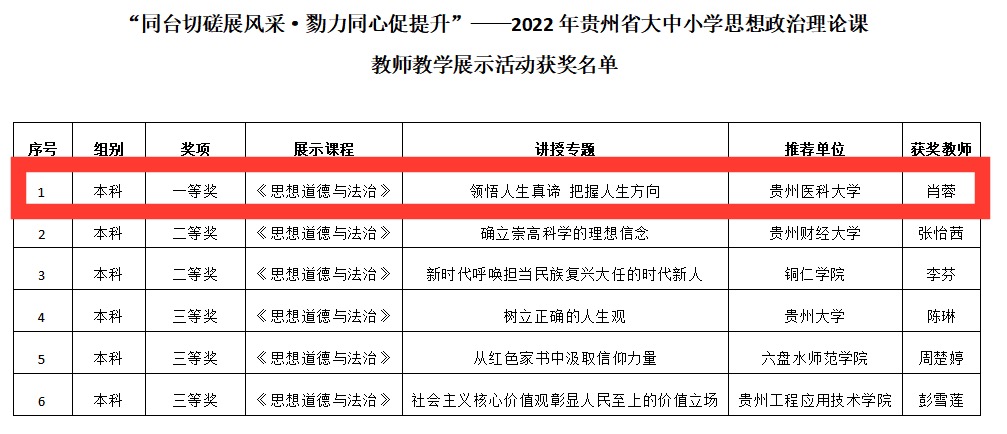 近日,省教育厅公布了“同台切磋展风采·勠力同心促提升”——2022年贵州省大中小学思想政治理论课教师教学展示活动获奖名单。国产自拍 教师肖蓉获教学展示活动《思想道德与法治》课程一等奖。