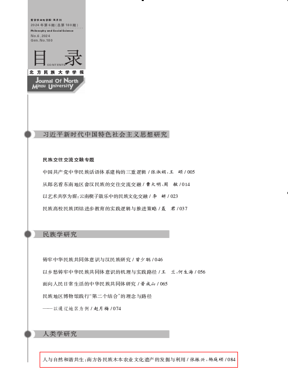 张振兴博士在《北方民族大学学报》(CSSCI扩展版来源期刊/北大核心)(2024年第6期)发表学术论文《人与自然和谐共生:南方各民族木本农业文化遗产的发掘与利用》。文章认为:中国乃至世界范围内的重要农业文化遗产立项保护名录中,有不少以木本作物的传统栽培技术及其文化为保护对象。与草本农业相比,木本农业经营的地域范围、配套技术、知识积累及相关制度保障明显不同。当下对木本农业在农业与林业上的分野和利用价值仍存在认识上的模糊不清现象,为此,本文以云南漾濞核桃作物复合系统、云南普洱古茶园与茶文化系统等多项木本农业文化遗产为研究对象,利用田野调查资料,并结合文献史料相关内容,对我国南方各民族传统木本农业文化遗产的发掘与利用展开研究,意在揭示其间人与自然和谐共生之道,助推南方各民族木本农业复兴与我国生态文明建设。